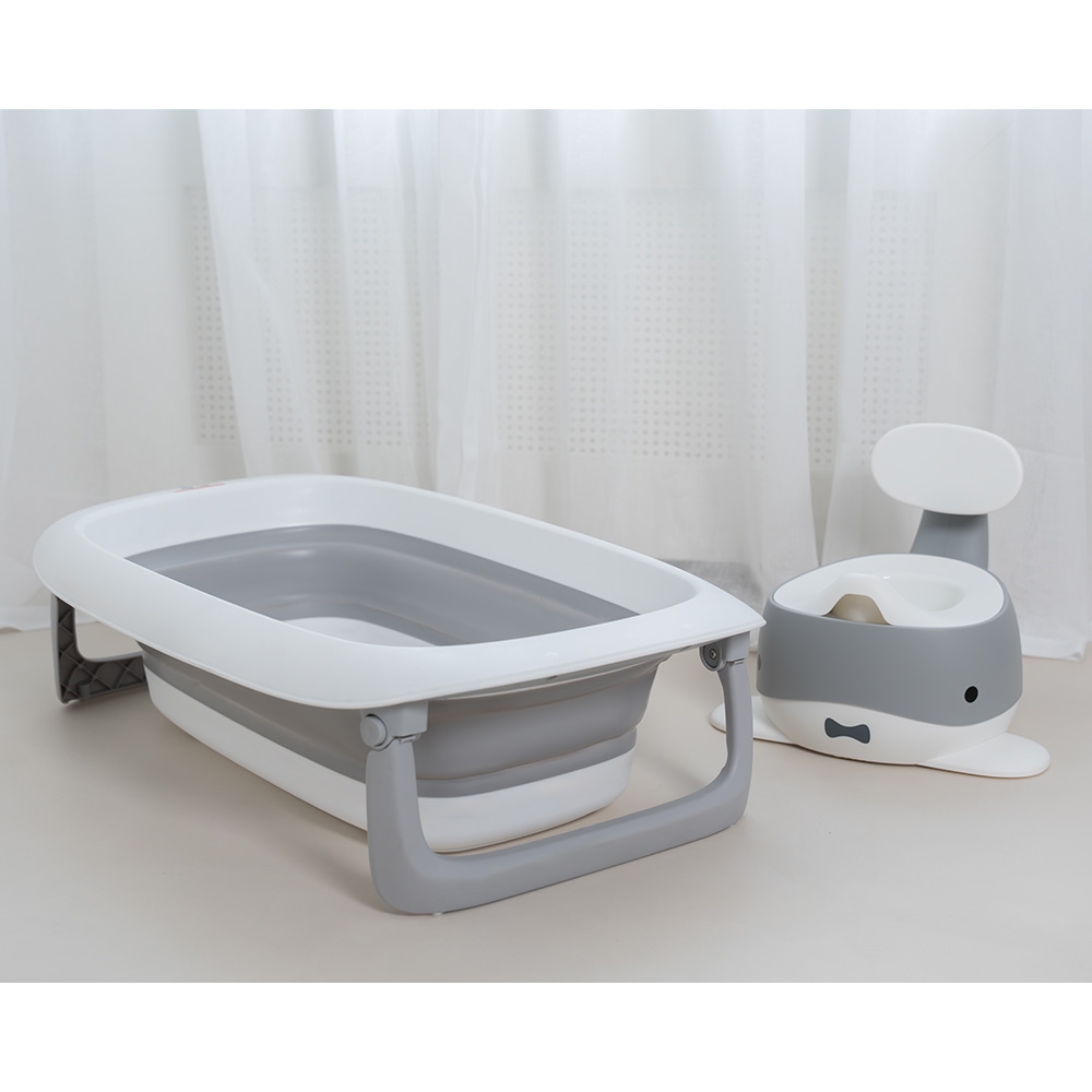 Foldebadekar i grå. Foldebadekarret har et praktisk design der egner sig til smalle steder, hvor pladsen kræver maksimal udnyttelse eller til rejsende familier. Den minimale størrelse i sammenklappet tilstand gør, at badekarret kan opbevares bag en dør eller i et skab. Benene er udstyret med skridsikker gummibelæg, der sikrer, at badekaret står fast på alle jævne overflader. Foldebadekarret er produceret af sikre materialer (fri for phthalater og tung metaller), der gør badningen for dit barn risikofrit.