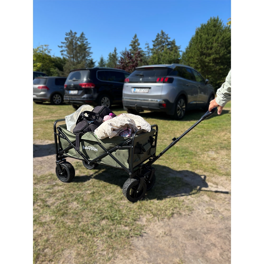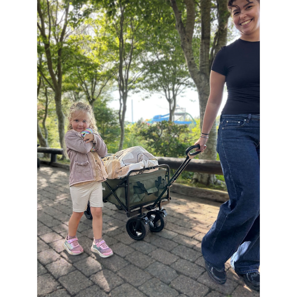 Trækvognen er udstyret med justerbart håndtag og bremse på forhjulene for ekstra sikkerhed. Stoffet dækker stellet og sikrer både et pænt udtryk og praktisk brug. Når vognen ikke er i brug, foldes den let sammen og fylder minimalt.