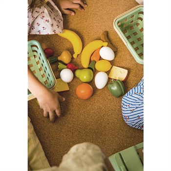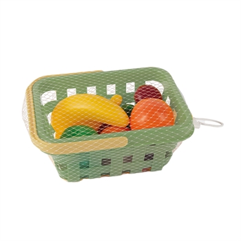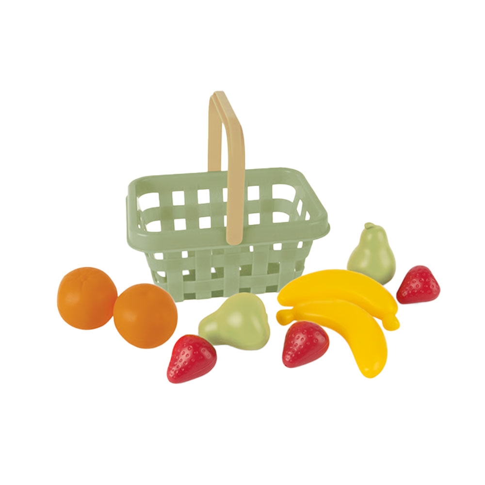 Sættet indeholder en solid grøn indkøbskurv fyldt med farverige og realistiske frugter som æbler, bananer, appelsiner og jordbær. Frugterne er sjove at lege med og understøtter barnets udvikling af finmotorik, øje-hånd-koordination og sociale færdigheder gennem rolleleg, købmandslege og samarbejde med andre børn eller voksne.