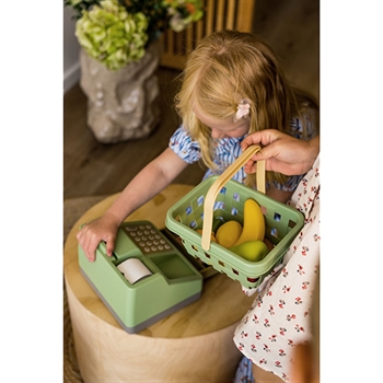 • Indeholder grøn kurv + realistiske frugter: æble, banan, appelsin, jordbær m.fl.