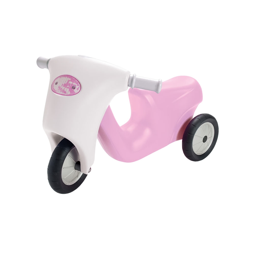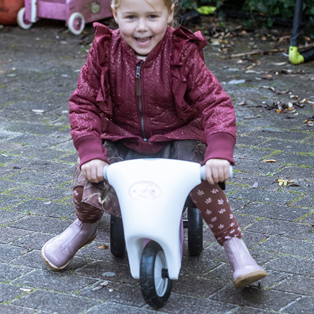 En charmerende trehjulet løbecykel i drømmende lyserøde og hvide nuancer. Perfekt til børn fra 2 år, der er klar til at udforske verden og styrke deres balance og koordination. Med tre solide hjul og et lavt ergonomisk sæde (26 cm højde) er scooteren ideel til små ben, der gerne vil styre farten selv. Det robuste stel og de støjsvage gummihjul giver både komfort og stabilitet på forskellige underlag.