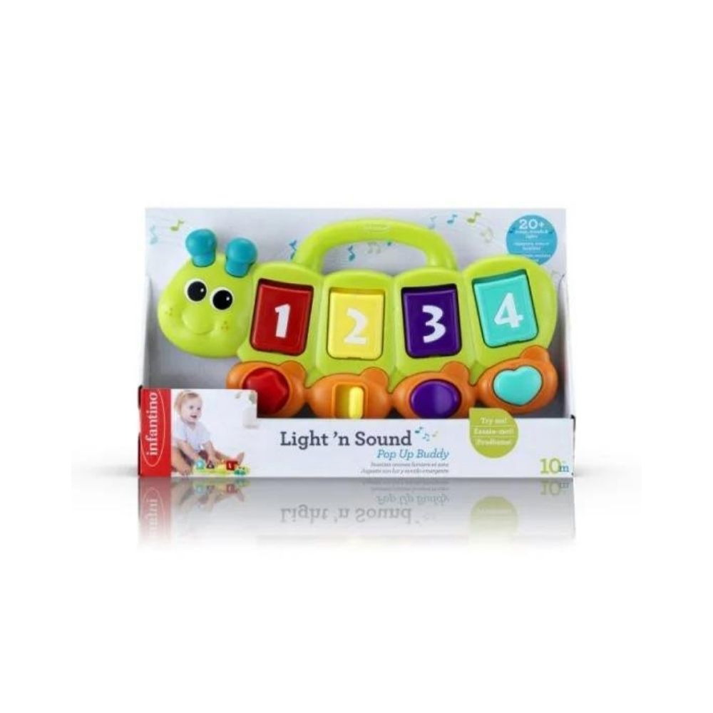 Infantino Kålorm med tal og pop up dyr vil underholde dit barn med forskellige funktioner og lyde. Kålormen indeholder 20 melodier og lys. Produktet anbefales til +10 mdr. Der medfølger 2x AA batterier.
