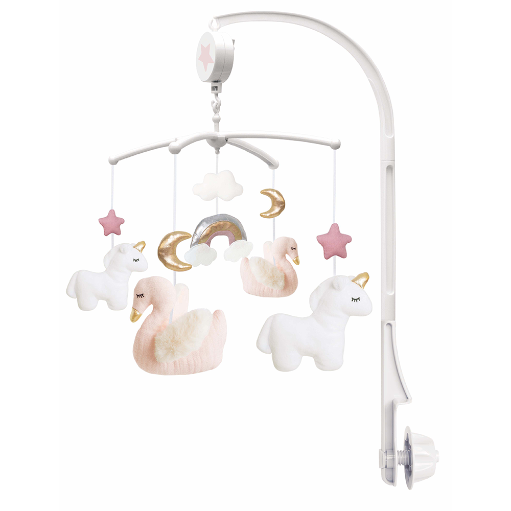 Sød og dekorativ musikuro til at hænge over puslebordet eller vuggen. Musikuroen kan være med til at skabe en tryg og fredfyldt atmosfære, som gør det nemmere at skifte bleen på barnet eller få ham/hende til at sove. Uroen drejer forsigtigt rundt mens den spiller musik, hvilket kan være med til at stimulerer barnets syn og hørelse.