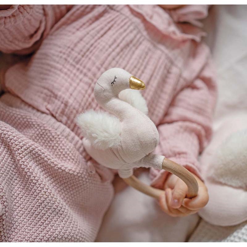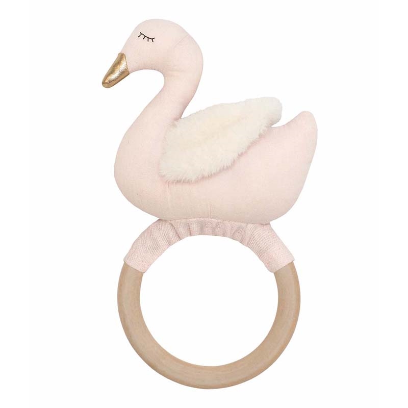 En fin rangle med svanemotiv. Træringen på ranglen gør det nemt for de små fingre at holde om ranglen. Den svage raslelyd er god til at stimulere høresansen hos de mindste børn. Svanen er lavet i blød bomuld og polyester, så den er behagelig at lege med.