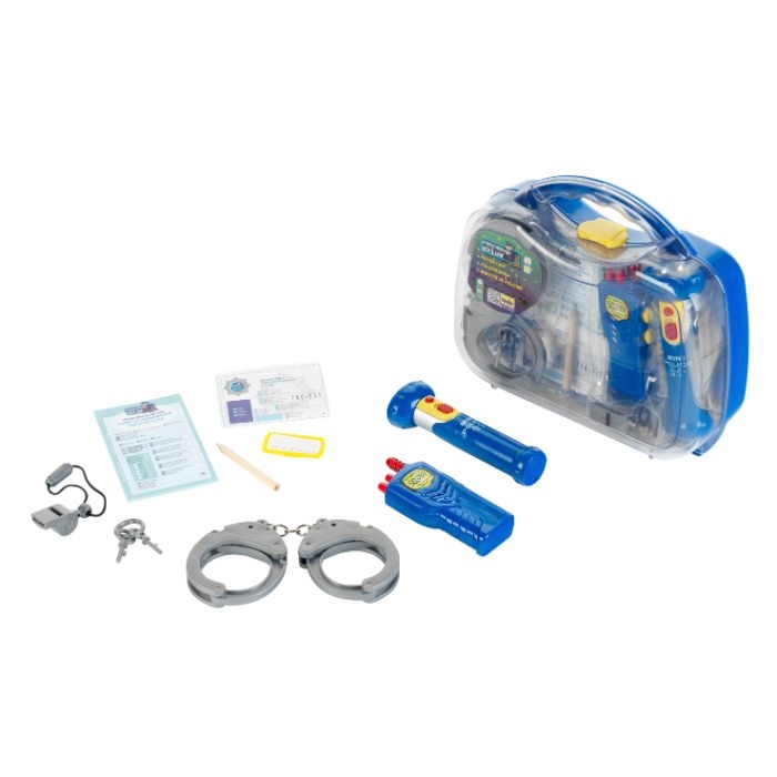 ID, blyant, fløjte, skilt Håndjern, lygte, walkie, bøder. Der medfølger ikke 2xAA batteri.