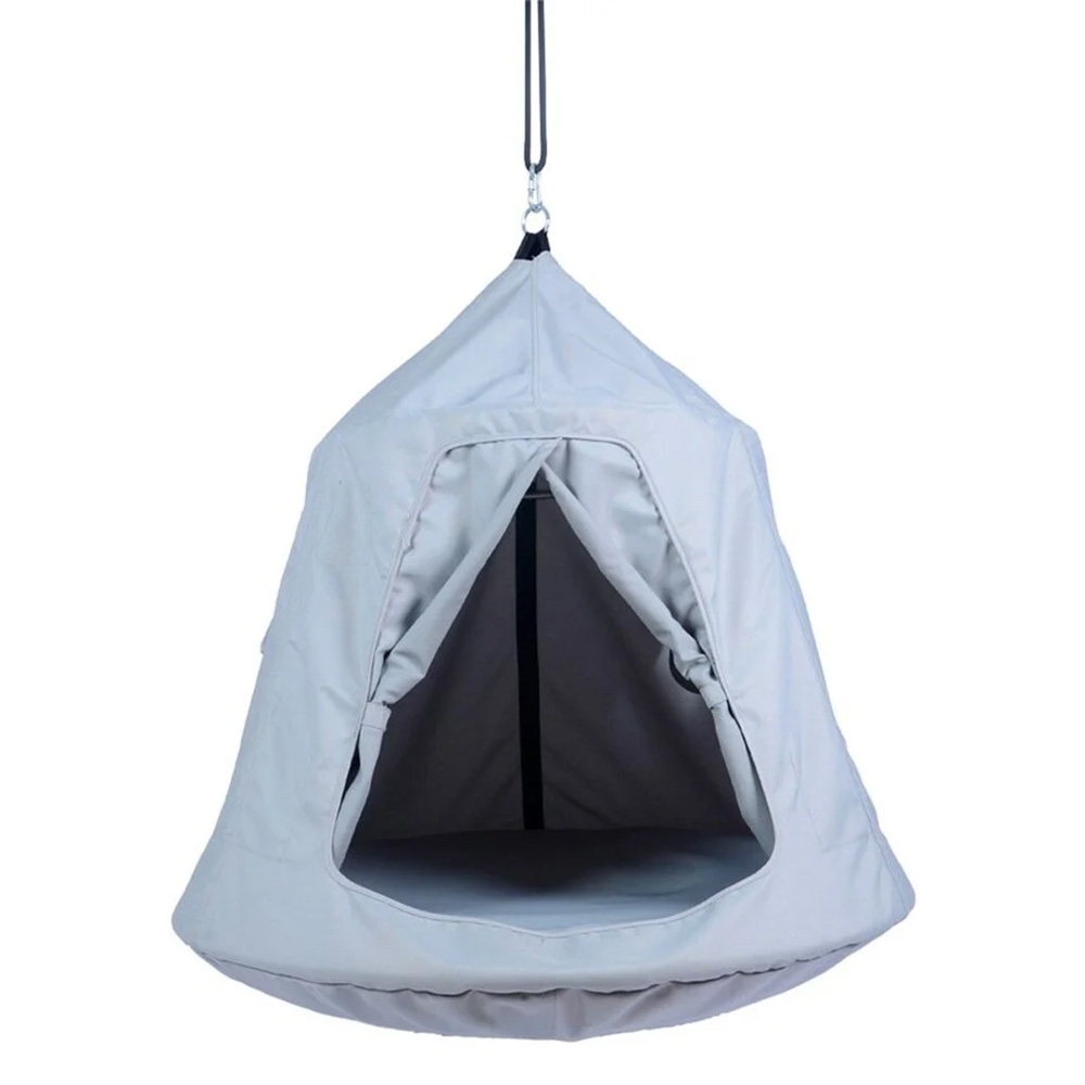 Dette hængende legetelt er det perfekte gemmested for børn at hygge sig, læse og lege. Hæng teltet i haven, i vuggestuen eller tag det med på tur. Teltet har desuden en oppustelig bund og der medfølger LED-lys for ekstra hygge og komfort. Teltet er lavet af UV-belagt polyester, måler 150 x 120 cm og har en max belastning på 120 kg, så der er plads til at invitere legekammerater indenfor og til at dekorere din helt egen hule med hynder og tæpper.