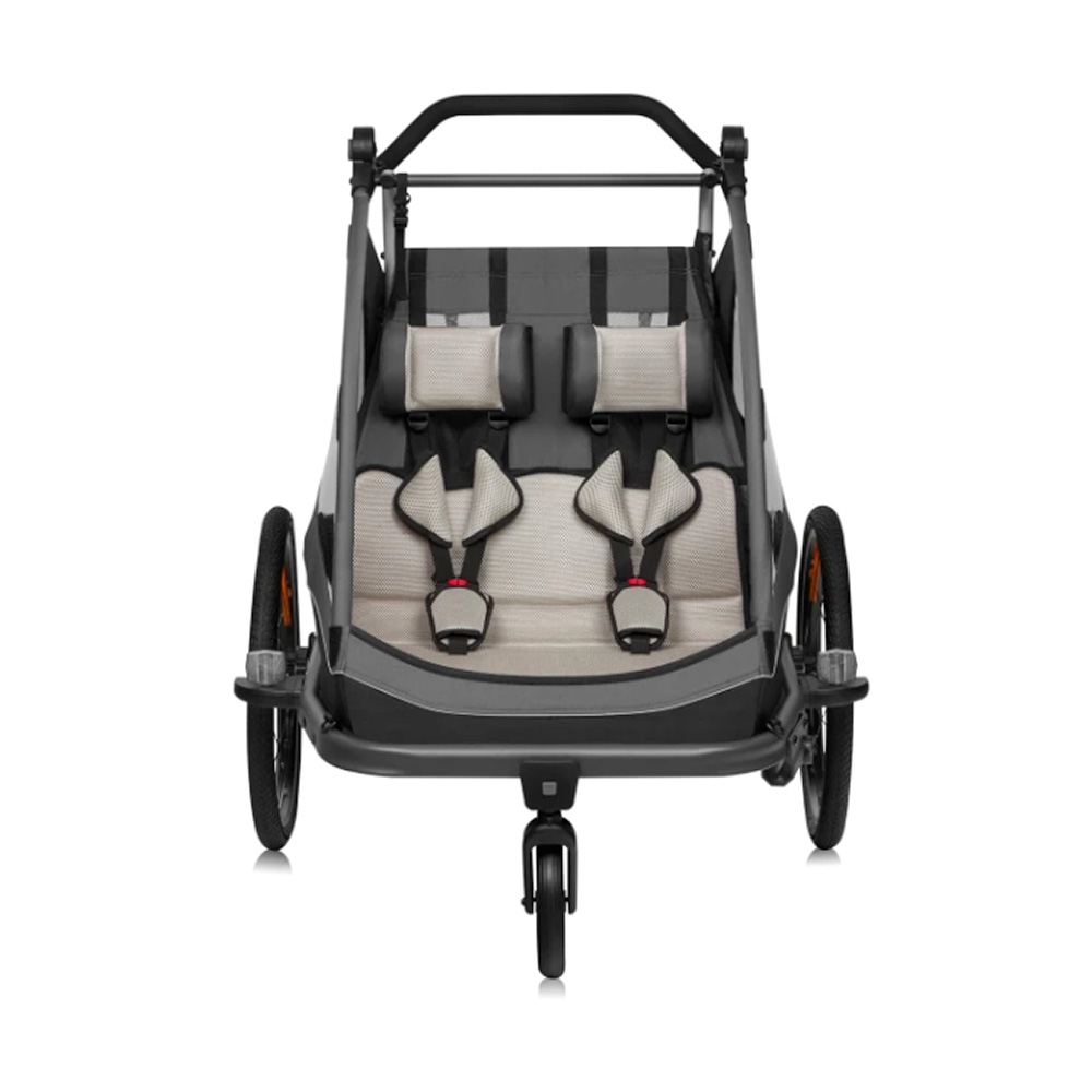 Sædet er fremstillet i åndbart Dri-Seat materiale, der hjælper med at reducere sved og øger komforten på længere ture. Den forstærkede bund gør det lettere for barnet selv at stige ind og ud af anhængeren. De store oppustelige hjul er velegnede til forskellige typer terræn og giver en stabil kørsel, mens forhjulet i slidstærkt EVA-skum bidrager til en jævn og komfortabel tur.