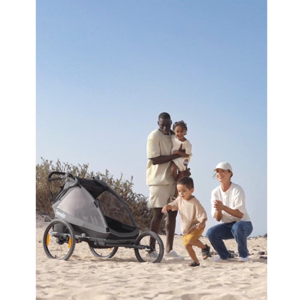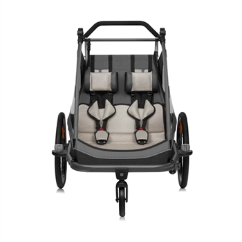 Cama kan bruges både som cykelanhænger og som klapvogn. Den er udstyret med to siddepladser, så du kan transportere to børn på samme tid, men den fungerer også perfekt til ét barn. Når du vil skifte funktion, afmonteres cykelarmen blot og erstattes med det medfølgende forhjul.