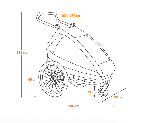 Med en bredde på omkring 80 cm kan anhængeren nemt komme gennem de fleste døre, butikker og offentlige områder. Den rummelige opbevaringsplads på hele 60 liter gør det let at have tasker, indkøb eller udstyr med på turen. Samtidig kan produktet foldes sammen, så det fylder mindre og er nemt at transportere i bilens bagagerum.