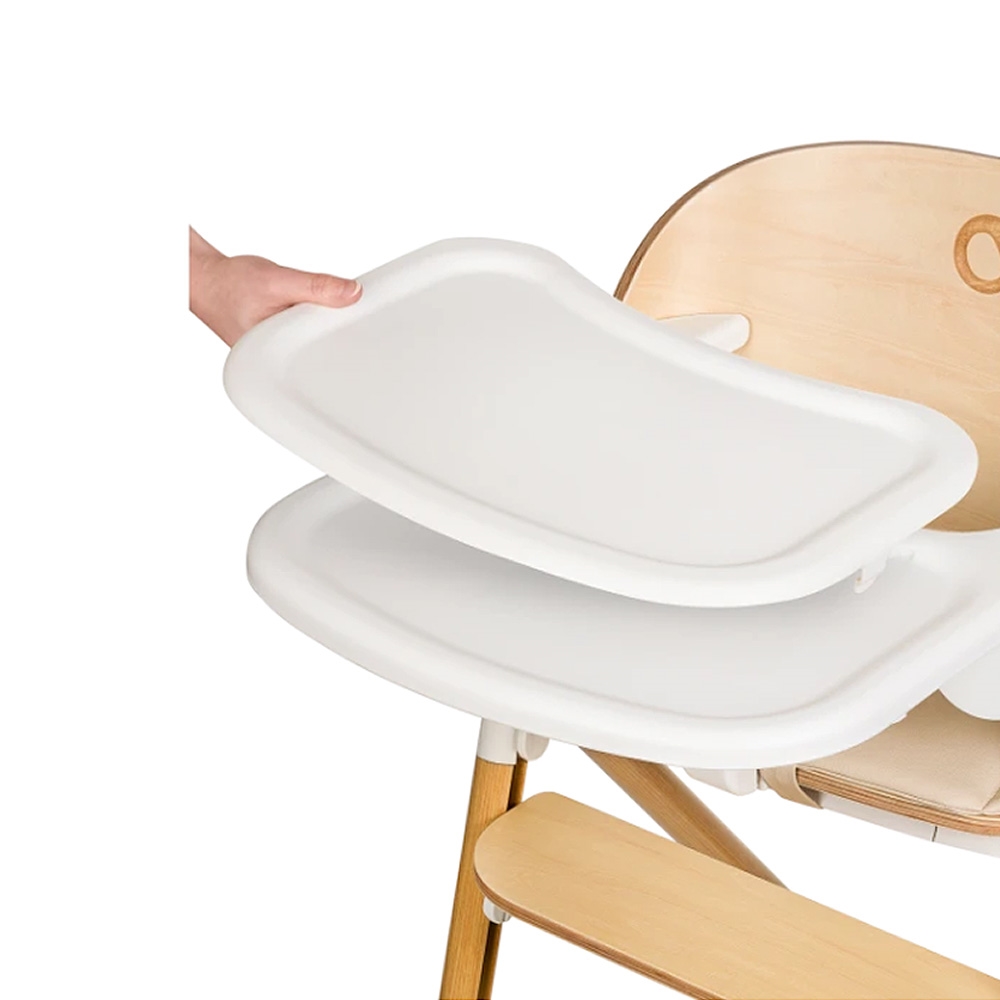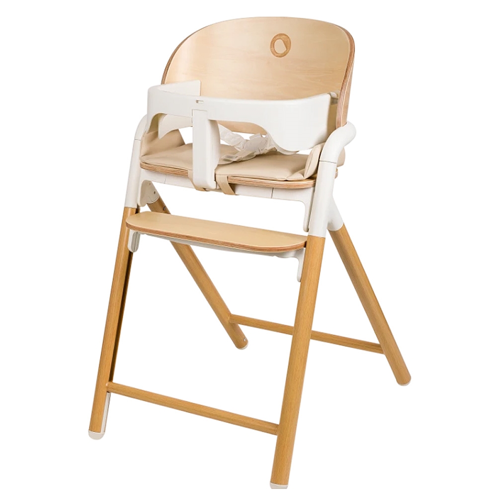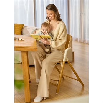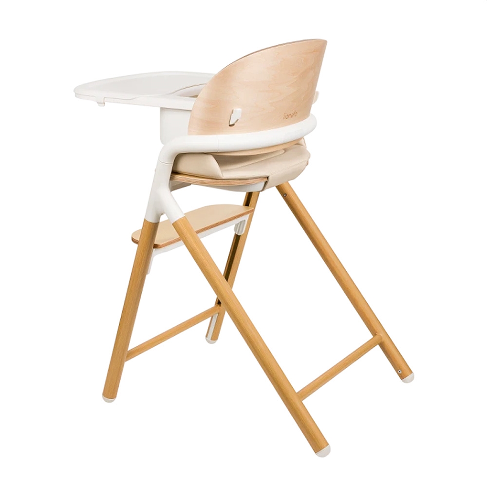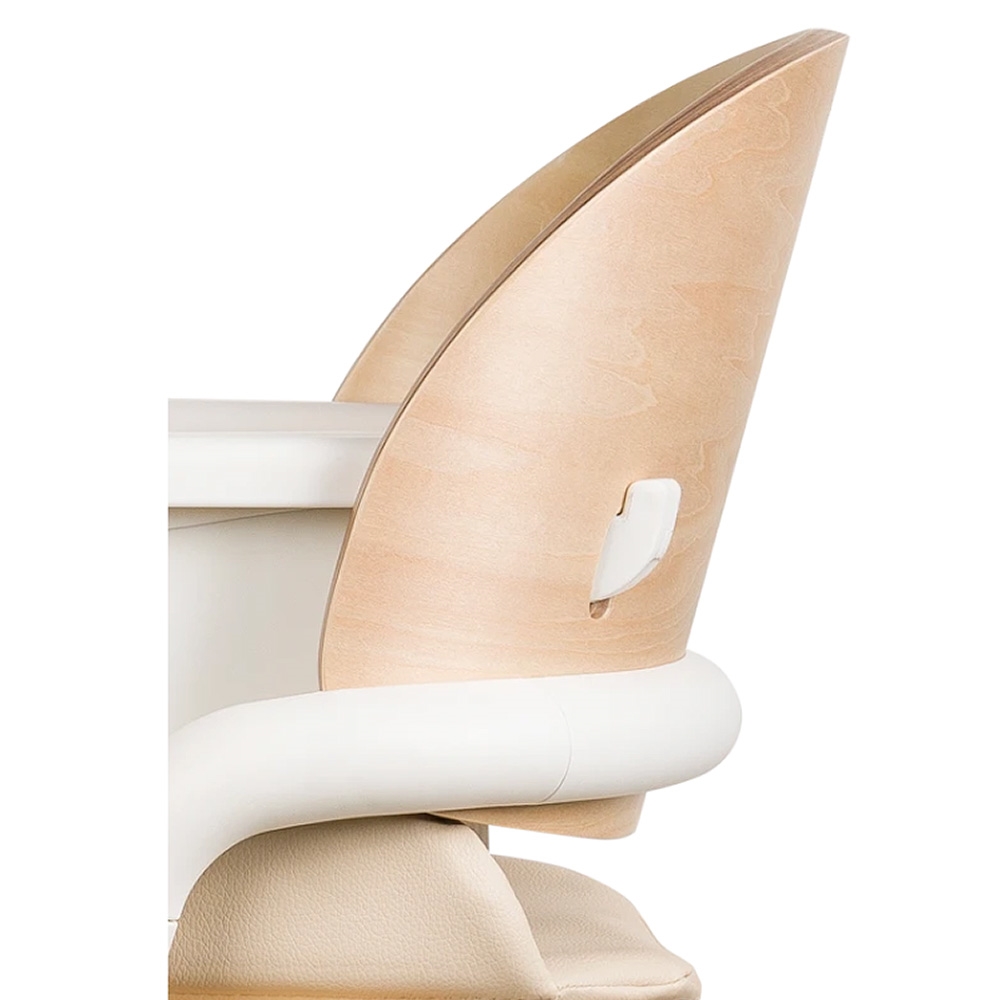 Det naturlige bøgetræ kombineret med aluminiumsdetaljer giver et moderne og stilrent udtryk, der passer smukt ind i hjemmet. Den høje ryg og den bløde indsats i øko-læder sikrer god siddekomfort, mens 5-punktsselen og sikkerhedsbøjlen skaber trygge rammer for de mindste.