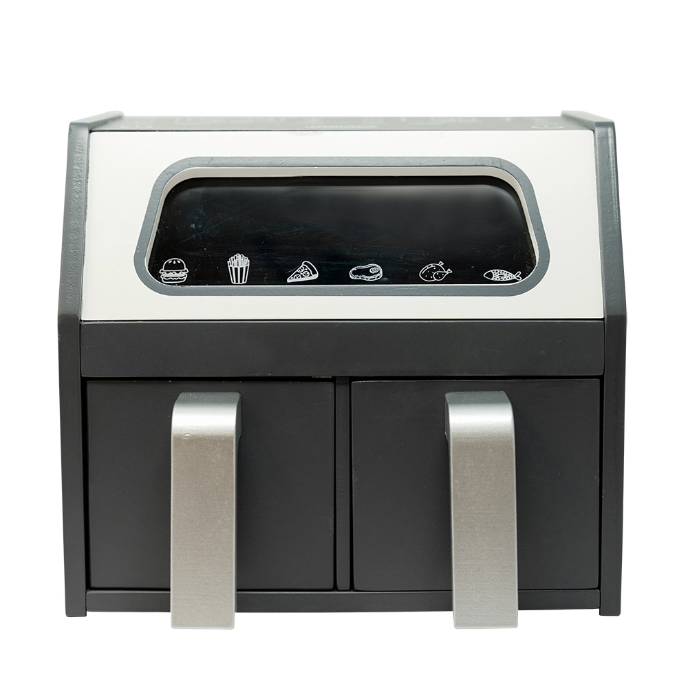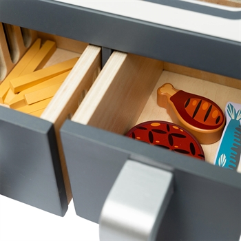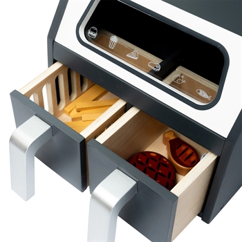 Den ene skuffe har lukkede sider, mens den anden skuffe har riller, hvilket gør den perfekt til at tilberede pomfritter. Gennem ruden med plexiglas kan de små kokke holde øje med deres kreationer, mens de bliver tilberedt.