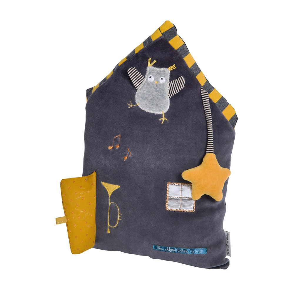 Aktivitetspuden fra Moulin Rotys serie Les Moustaches' bløde materiale gør, at barnets komfort er maksimal, og derfor er den dejlig for dit barn at til ligge med. Riv, føl, ryst eller træk for at opleve stjernen, trompetens og uglens forskellige lyde.