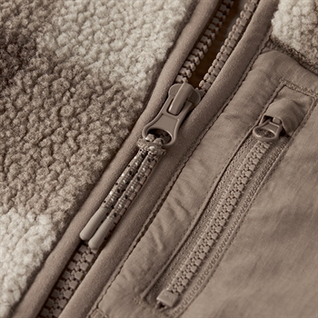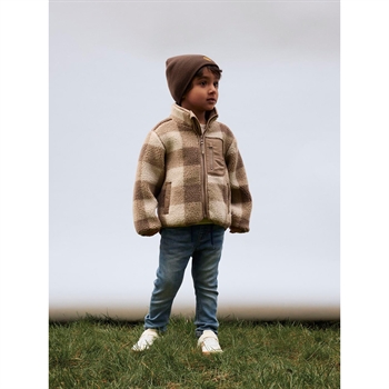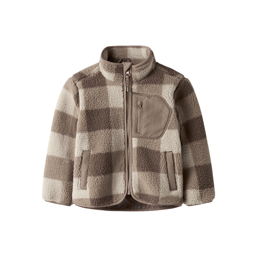 Sherpa-jakke fra Name It i beige og brun med ternet mønster. Jakken er lavet af 100% polyester med en blød sherpa-tekstur.