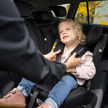Den medfølgende base med Top-Tether gør det muligt at dreje autostolen 360 grader i alle vækstfaser. Drej stolen mod bildøren, sæt barnet komfortabelt i, og drej den tilbage i kørselsposition.