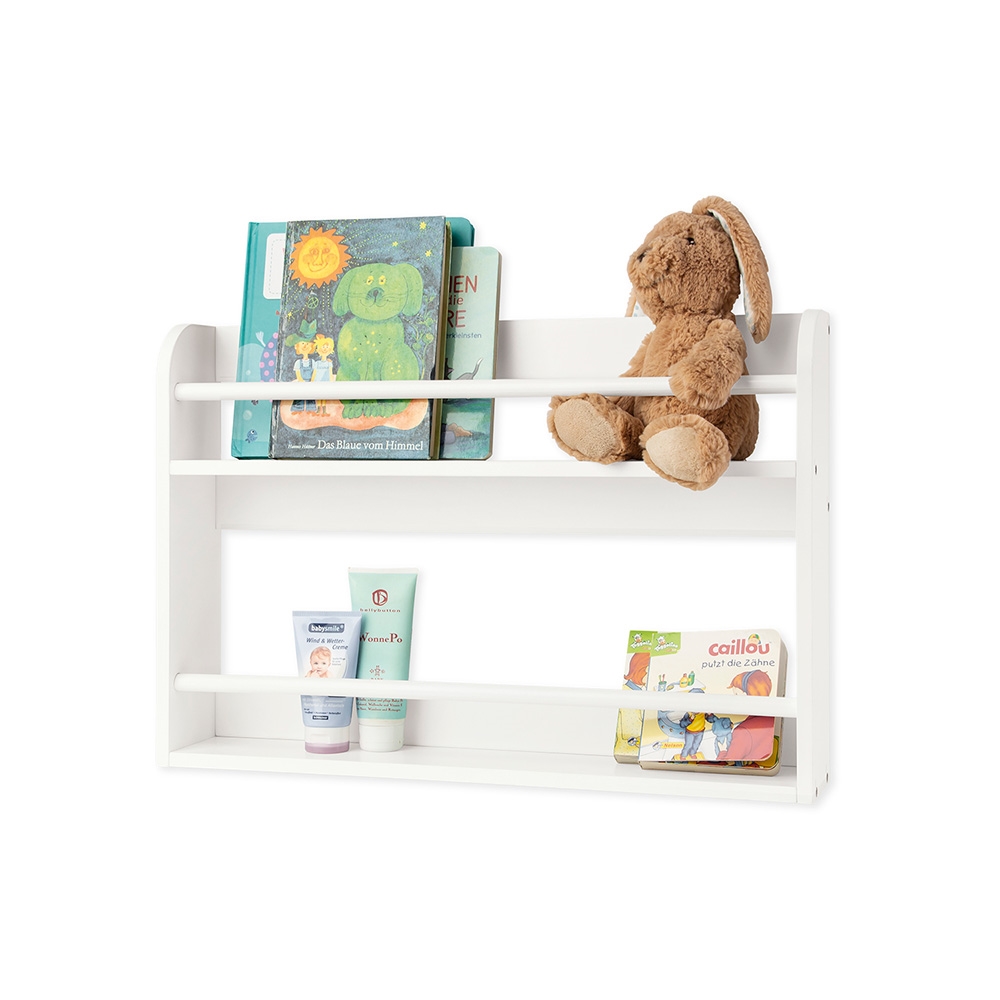 Væghylden ‘Jori’ er en funktionel og pladsbesparende løsning til børneværelset, og den giver ekstra opbevaringsplads til bøger, legetøj og bamser.
