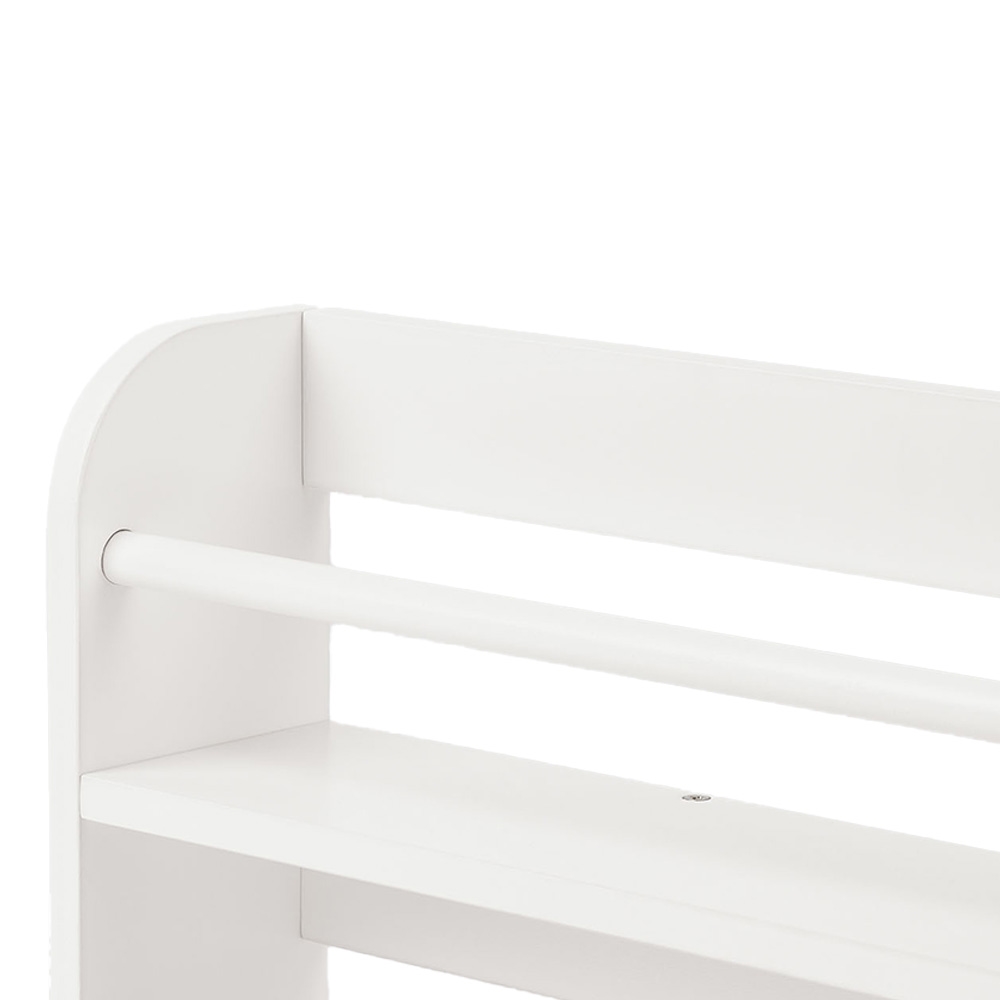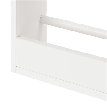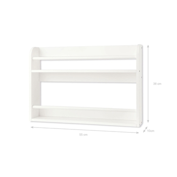 Hylden måler 55 cm i bredden, 10 cm i dybden og 38 cm i højden og er fremstillet i hvidlakeret MDF, som giver et lyst og tidløst udtryk. Det enkle design gør, at ‘Jori’ nemt kan kombineres med andre møbler og passer ind i de fleste indretninger. De to åbne rum giver et godt overblik over barnets yndlingsbøger og gør det nemt at holde orden. Med en maksimal belastning på 15 kg er der også plads til større og tungere bøger.
