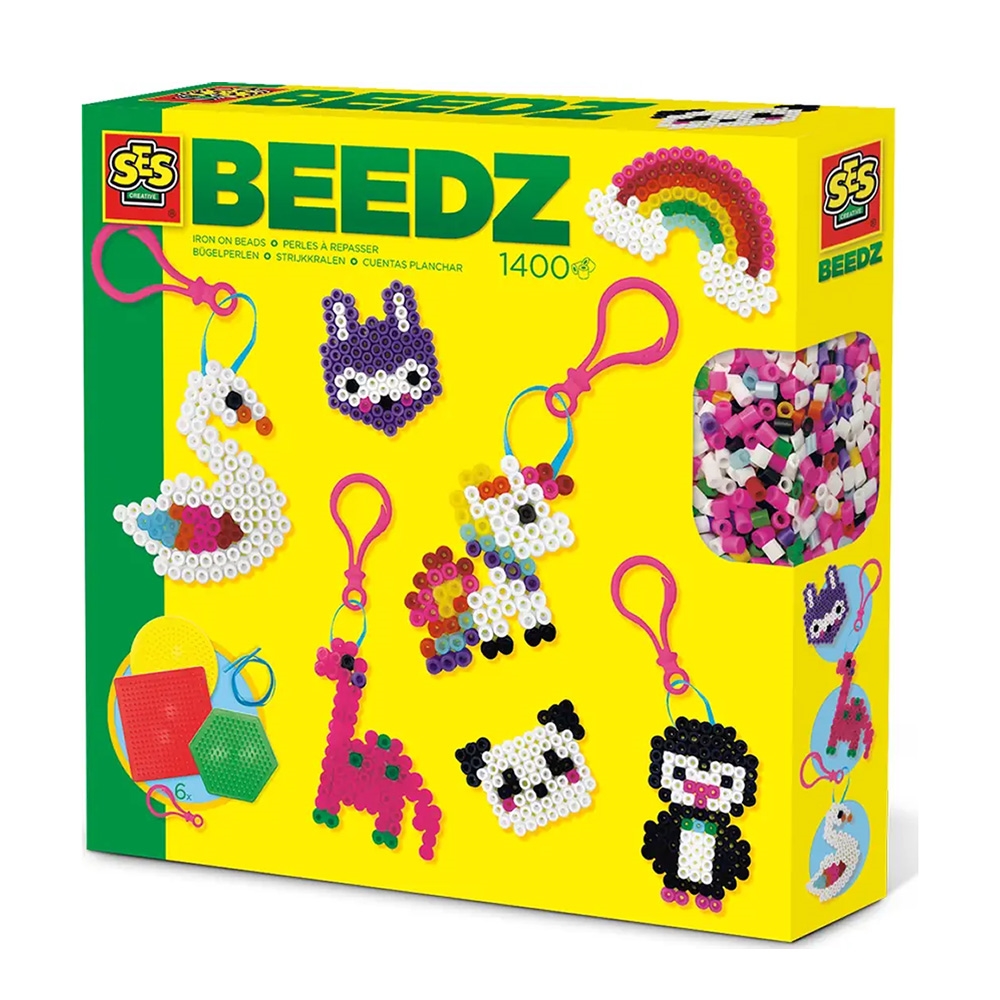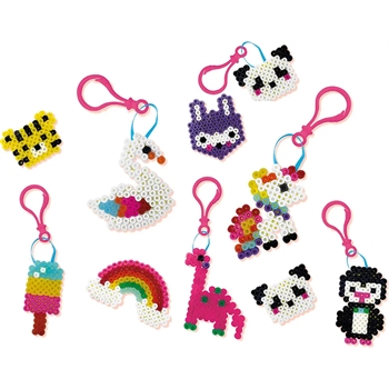 • Indeholder: firkantet perleplade, rund perleplade, sekskantet perleplade, perleblanding med 1400 stk., 6 nøglekæder, snort, strygepapir, vejledning.