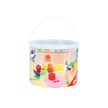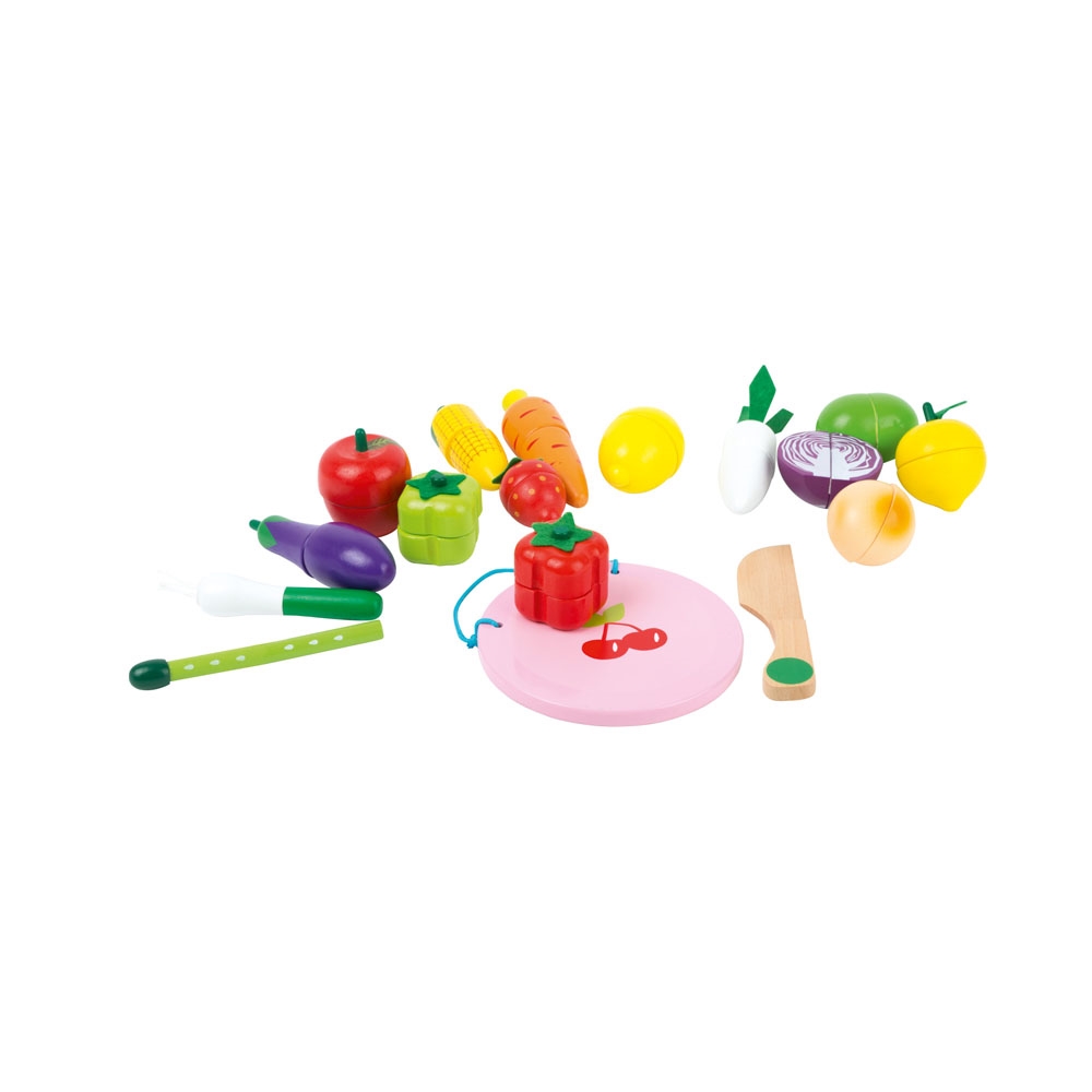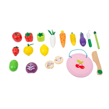 Grøntsager og frugt i træ med velco, hvor der medfølger skærekniv og tallerken.