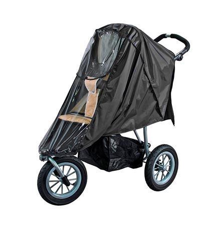 Det sorte regnslag er universelt og passer derfor til en almindelig jogger og klapvogne med 4 hjul.