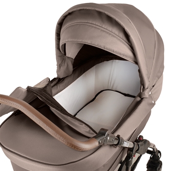 Skøn barnevogn med et langt liggemål på hele 97 cm. Barnevognskassen har rygstøtte, madras og aftageligt, vaskbart betræk. Kalechen er ventileret for optimal cirkulation i vognen og har solsejl samt integreret myggenet. Håndtaget er betrukket med behageligt blødt kunstlæder, og styret er højdejusterbart.