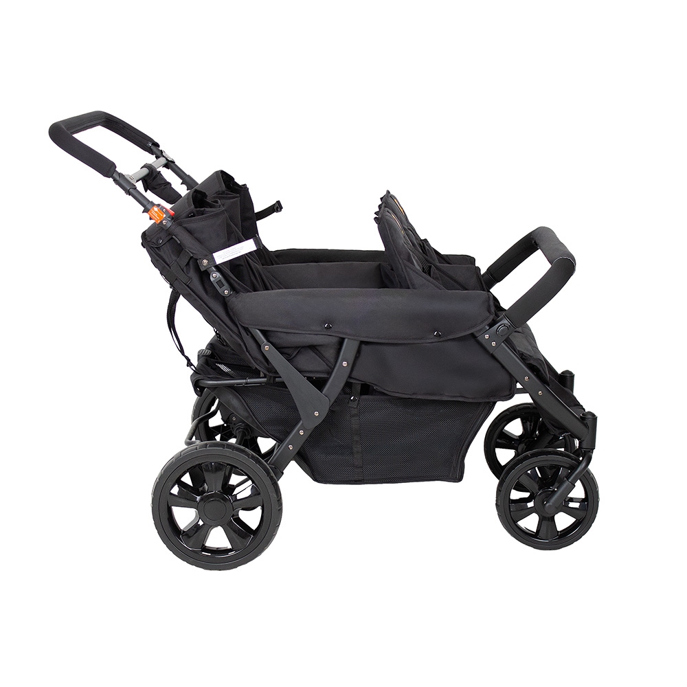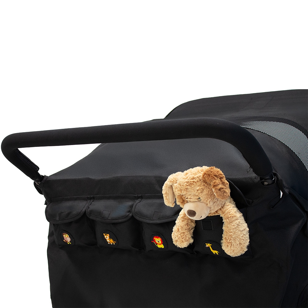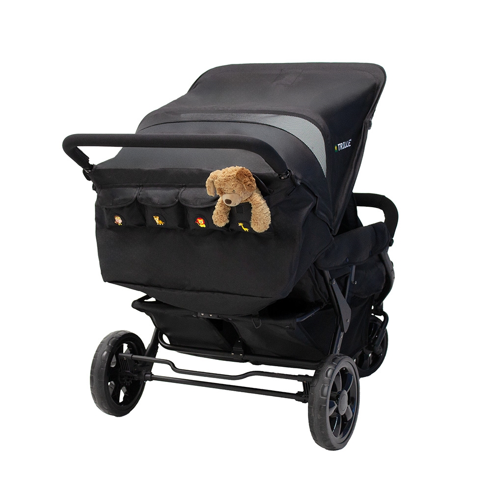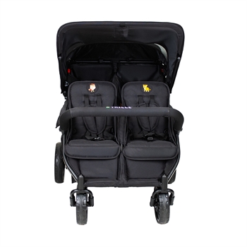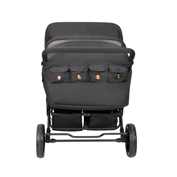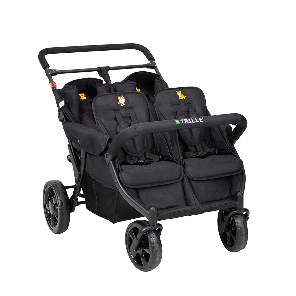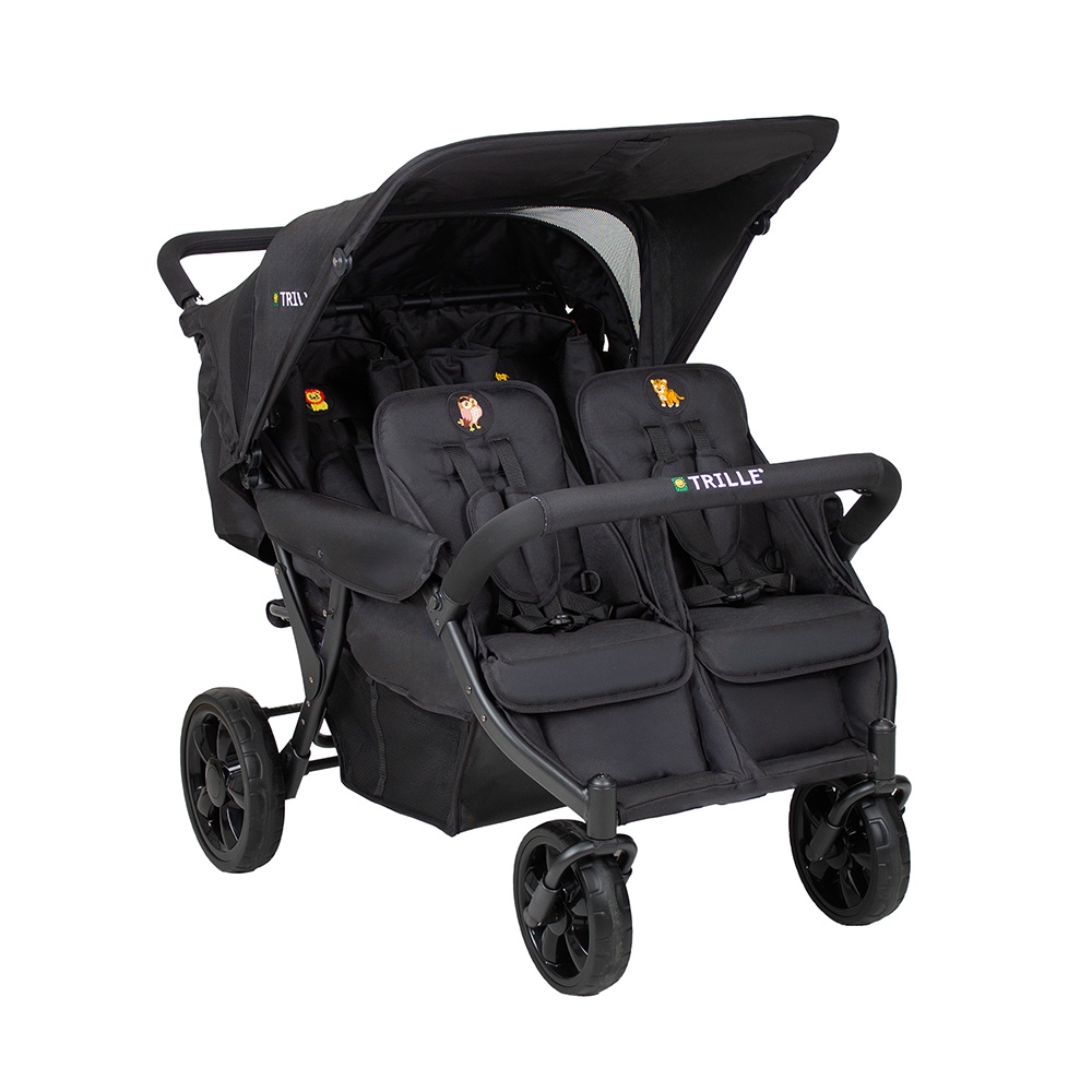 Institutionsklapvogn. En smart institutionsklapvogn med 4 siddepladser og i 4 forskellige dyremotiver. På vognenes bagside findes der 4 lommer med samme dyremotiver som sæderne. Således er der en lomme til hvert sæde, som barnet kan have sine helt private ting i. Vognen har punkterfrie hjul, som kræver mindre vedligeholdelse - og forhjulene er drejelige, så den er let at køre med. Desuden er vognen udstyret med justerbar fodstøtte og stor rummelig varekurv. Klapvognen er fremstillet i slidstærkt stof, som er nemt at rengøre. Stellet er fremstillet i letvægtsstål. Sæderne på vognen er beregnet til børn fra 6 måneder – ca. 3 år