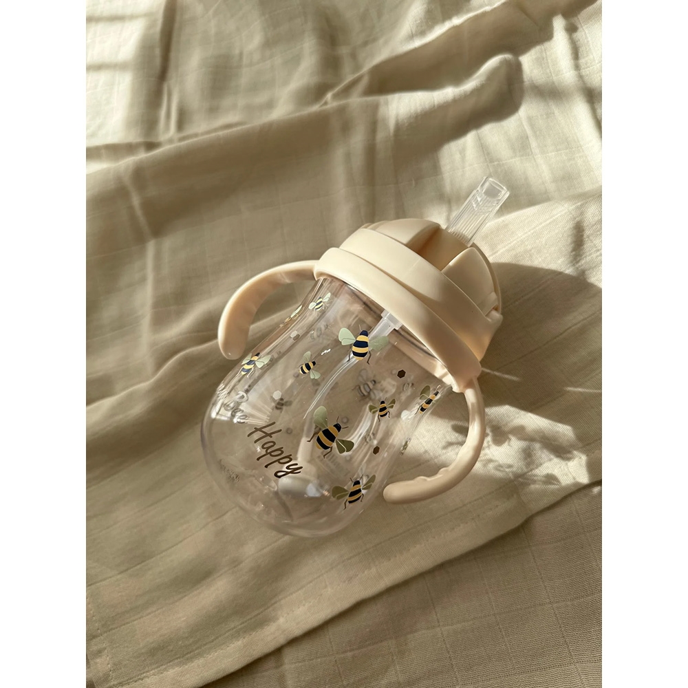 Den har det sødeste print af små bier. Der er to smarte håndtag, så de mindste kan sidde med den, og et smart silikone sugerør. Sugerøret er drypfrit og har en kugle i enden, som gør det muligt at drikke, selv når den bliver vendt på hovedet.