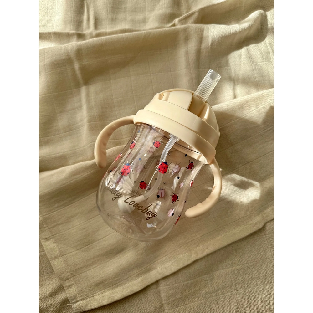 Den har det sødeste print af små mariehøner. Der er to smarte håndtag, så de mindste kan sidde med den, og et smart silikone sugerør. Sugerøret er drypfrit og har en kugle i enden, som gør det muligt at drikke, selv når den bliver vendt på hovedet.